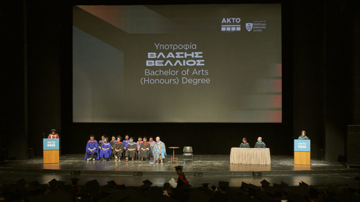 “The partnership between AKTO and Middlesex is one of the university’s longest standing, and one of which we are proud. The range of Middlesex-validated programmes offered by AKTO continues to grow and develop. I have seen first-hand not only the professionalism and commitment of your tutors, but also the amazing outcomes – your creative work – which is clearly of the very highest standard. Your tutors and staff here at AKTO are special people – inspiring, passionate, and committed to help you succeed. […] It is very humbling for me to be speaking to you in the city where so many of the principles of art, design and the expression of human individuality were conceived; indeed where our modern understanding of what it means to be human was created. […] Υou can think of yourselves as not simply graduating to join the world’s workforce in the creative industries, but as being people who can be inspired to bring depth, insight, beauty, truth, vision, and purpose – both to your disciplines and beyond.