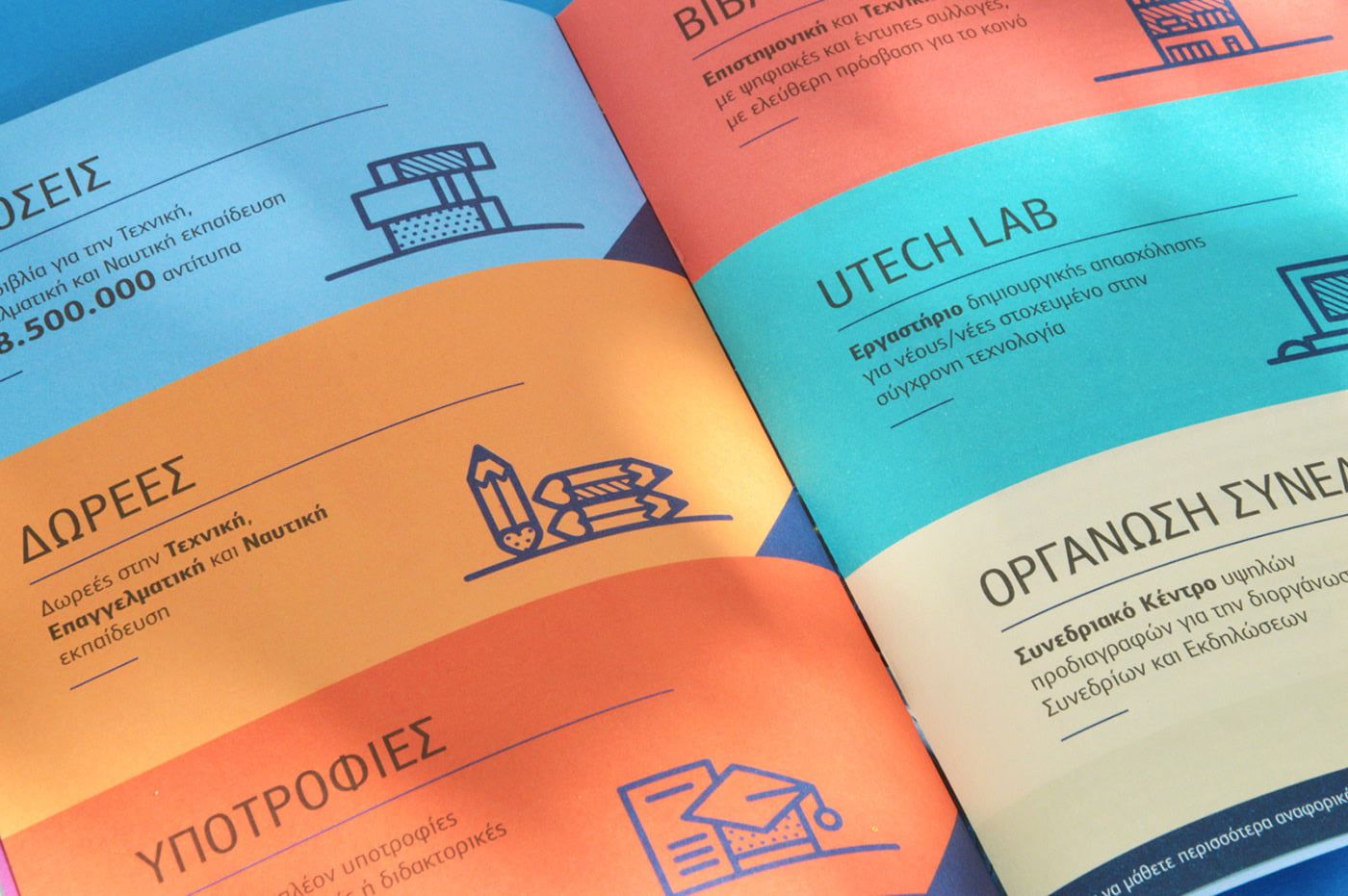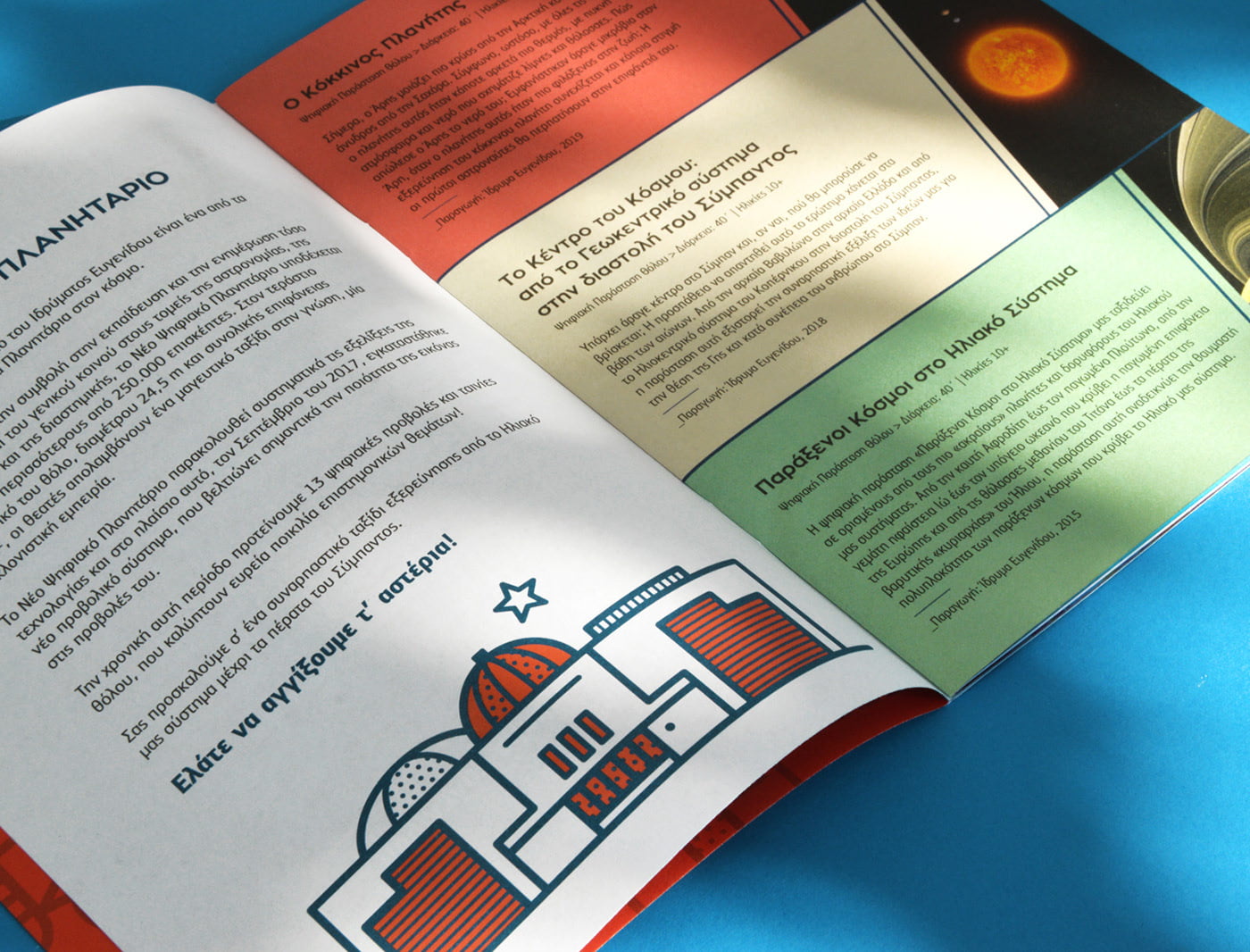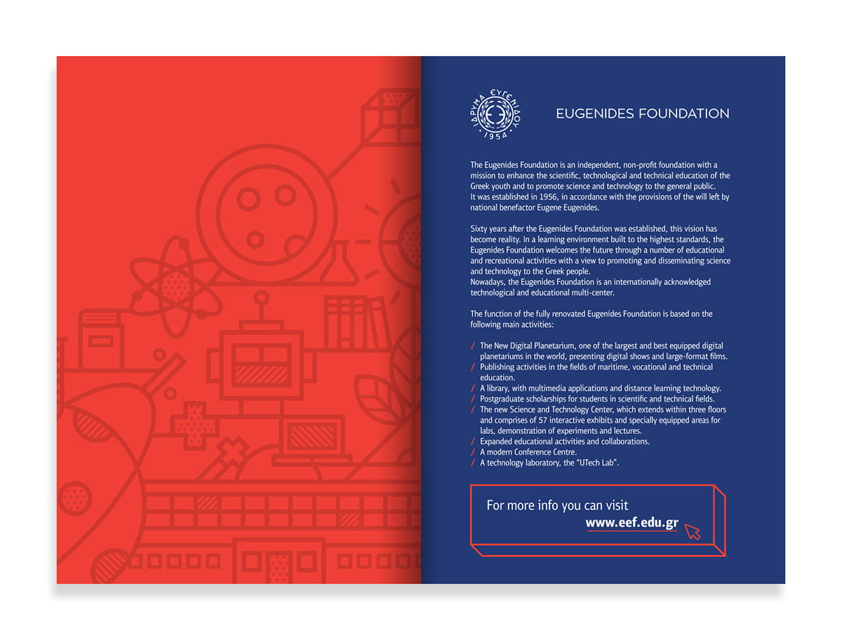 Tο σύνολο της δουλειάς (έντυπο με το ετήσιο πρόγραμμα δράσεων, θεματικά φυλλάδια εργαστηρίων, αφίσες, social media posts) δημιουργήθηκε με στόχο να αποτυπώσει τον θαυμαστό κόσμο γνώσης που αποκαλύπτεται μέσα από το Ίδρυμα, το οποίο από το 1956 λειτουργεί με σκοπό την προώθηση της επιστήμης & της τεχνολογίας στο ευρύ κοινό. Στο συγκεκριμένο project, για τον designer το στοίχημα ήταν να κρατηθεί η ισορροπία ανάμεσα στο minimal/σοβαρό και στο παιχνιδιάρικο/φρέσκο. Και νομίζουμε ότι κερδήθηκε!